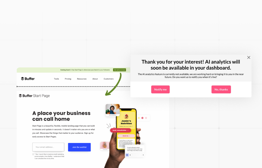 Agradece pelo interesse e sugere algumas opções, como "me notifique quando estiver pronto". Você mede: clicks, taxa de conversão, contexto, quem clicou. Dessa forma você mede a inteção REAL dos usuários com relação à funcionalidade.